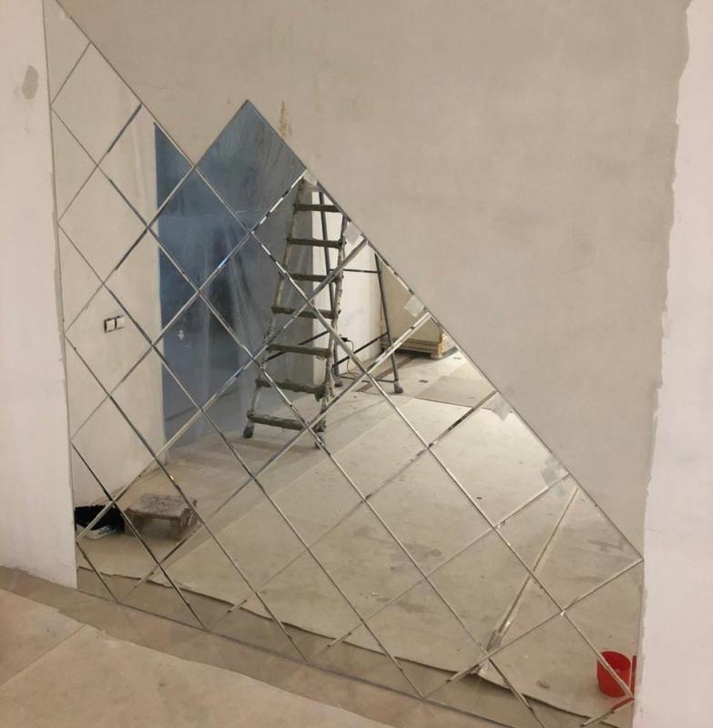 Использована зеркальная квадратная и треугольная плитка с фацетом.
