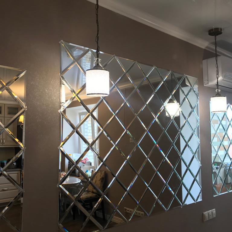 Использована серебристая квадратная зеркальная плитка размером 18х18.