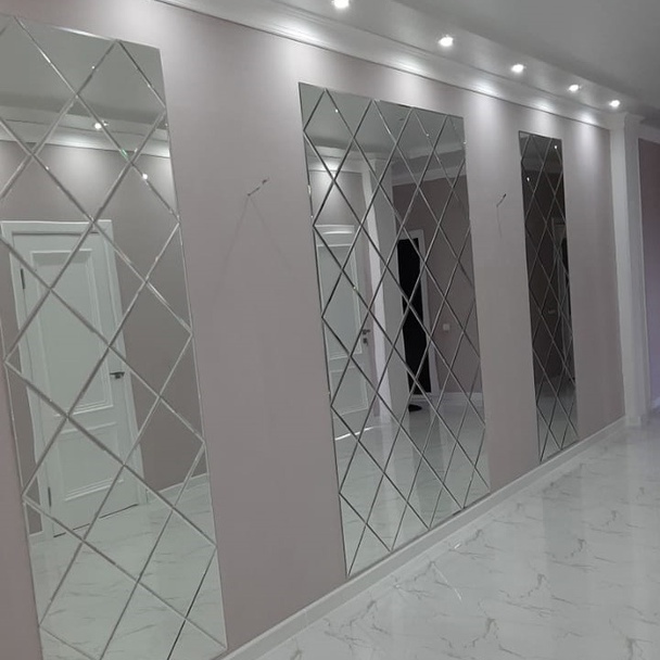 Для украшения использовалась зеркальная плитка формы вытянутый ромб серебряного цвета.